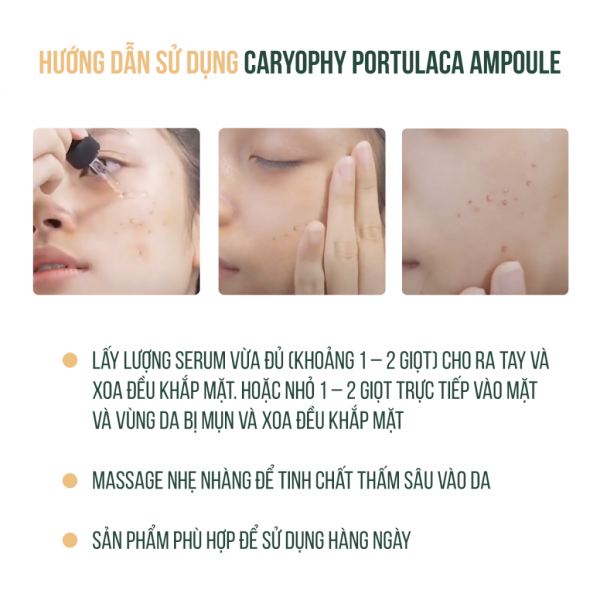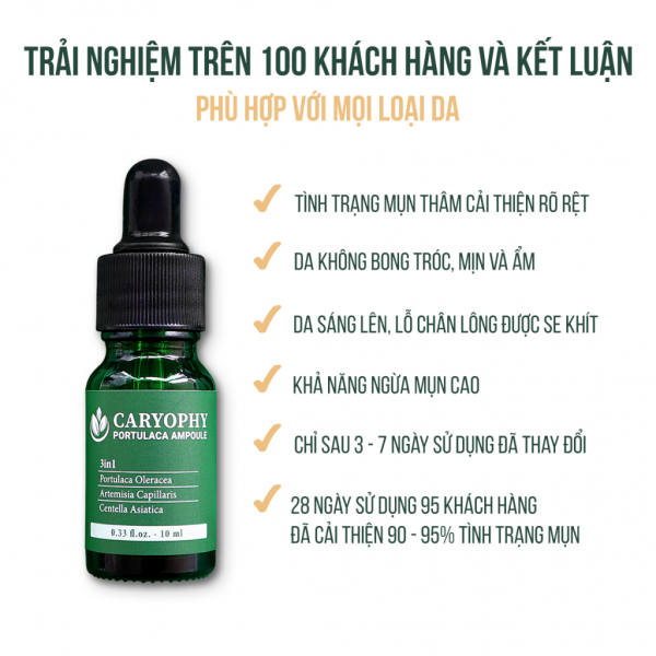 ✔️ Serum Caryophy Portulaca Ampoule trị mụn trị thâm với các thành phần lành tính 100% từ thiên nhiên an toàn phù hợp với mọi loại da: Da thường, Da dầu, Da hỗn hợp, Da khô, Da nhạy cảm, Da mụn.